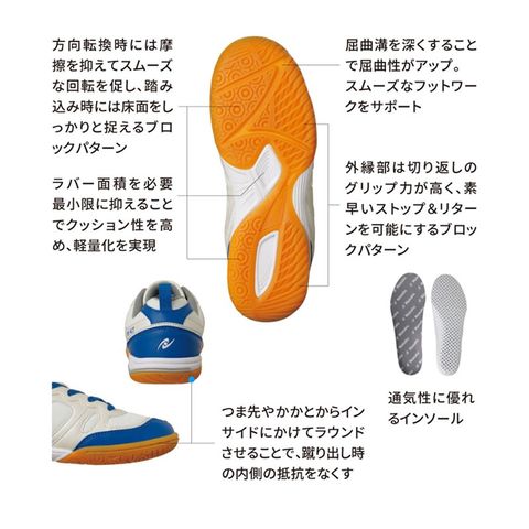 メッシュ素材で通気性と軽量化を実現!卓球の動きに適したアウトソールで足元を支えます。