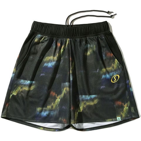 ダークトーンのネオンカラーのマーブル柄の総柄ショーツ。