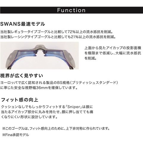 機能:曇り止めレンズ、UVカット、鼻ベルト5サイズ付属、FINA承認ゴーグル