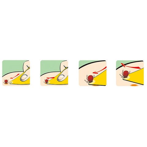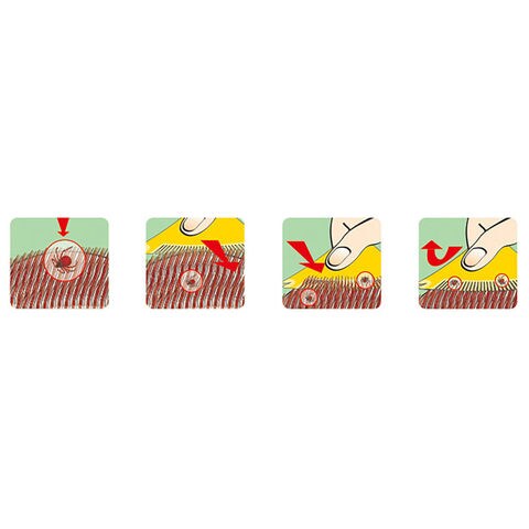 機能1:カードの3つの切り込み部分をダニの大きさに合わせて選択し、ダニと皮膚との間にスライドさせ、カードを少し持ち上げてさらにスライドさせると容易に取り除くことができます。