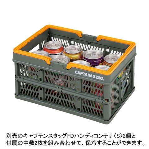 別売のキャプテンスタッグFDハンディコンテナ〈S〉2個と付属の中敷2枚を組み合わせて、保冷することができます。