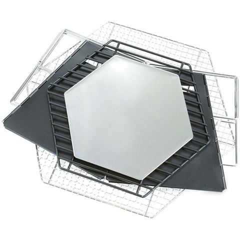 ●材質:本体・ロゴプレート=ステンレス鋼(焼付塗装)、底板=ステンレス鋼、バーキュー網・スタンド=鉄(クロムめっき)、目皿=鉄(焼付塗装)