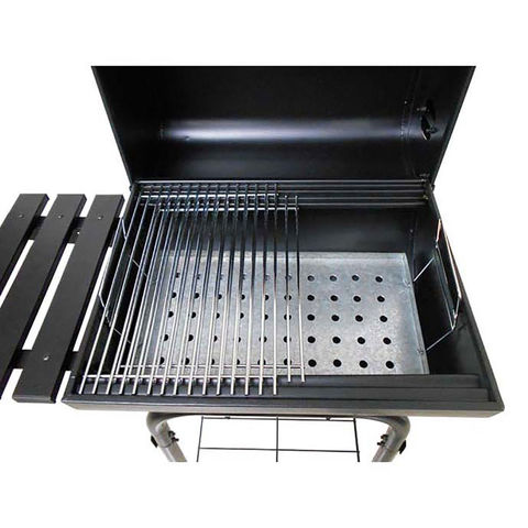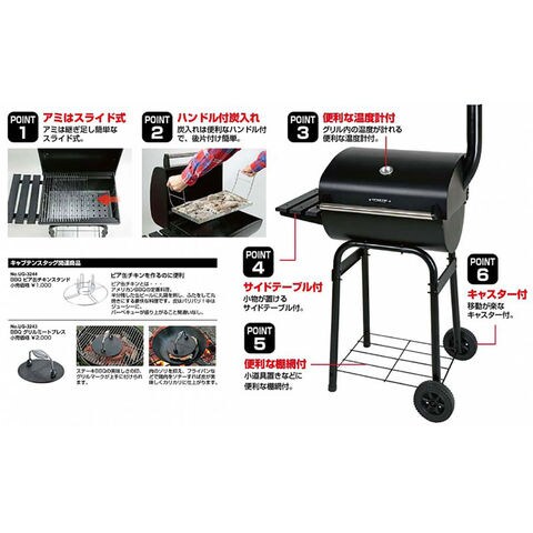 素材:本体・ふた・フレーム・サイドテーブル・棚網・煙突:鉄(エポキシ樹脂塗装)、バーベキュー網・ハンドル(目皿用):鉄(クロムめっき)、目皿:亜鉛めっき鋼板、バー:ステンレス鋼、車輪:ポリプロピレン