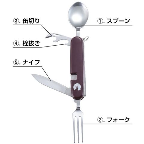 機能:1.スプーン、2.フォーク、3.缶切リ、4.栓抜キ、5.ナイフ