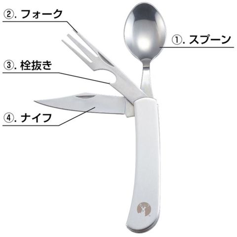 機能:1.スプーン、2.フォーク、3.栓抜キ、4.ナイフ