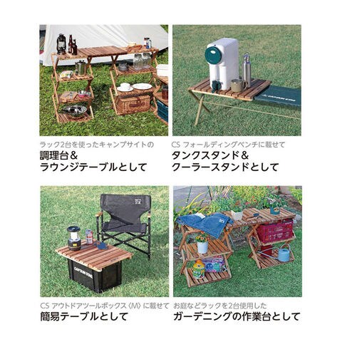 木製ラック(別売)2台と組み合わせて、キャンプサイトの調理台&ラウンジテーブルやガーデニングの作業台として使えます。