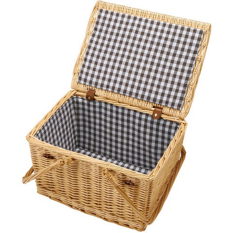 柳で編んだ、ふた付き・内布付きのバスケット。