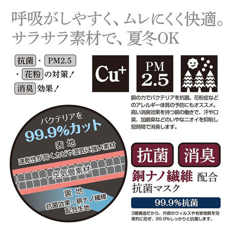 高い消臭効果を持つ銅の働きで、汗や口臭、加齢臭などのいやなニオイを抑制し短時間で消臭します。