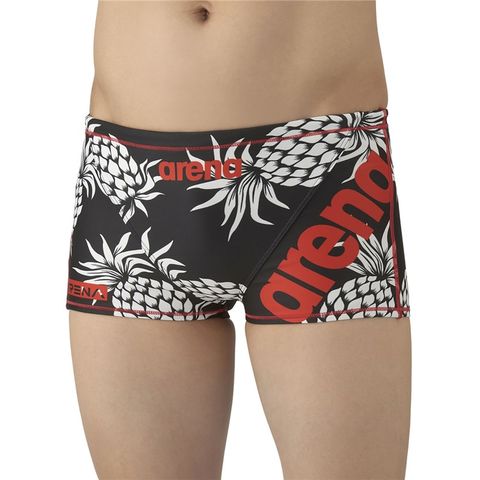 アリーナロゴが左腿に配置されたデザインの練習水着。