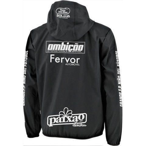 様々なロゴプリントでデザインされた南米テイストあふれるインパクトがあるピステフード付きフルジップジャケット。