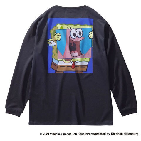 パトリックの顔を持ったスポンジ・ボブのイラストを大きくプリントしたバックプリント長袖Tシャツ。