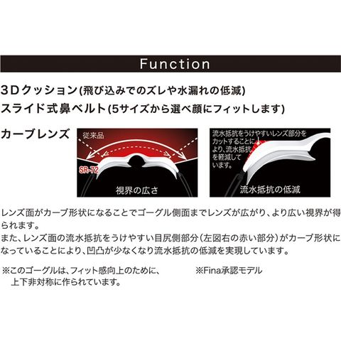 飛び込みやターンでブレない3Dクッション付レーシングゴーグル。