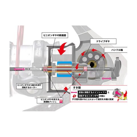 回転するピニオンギアと前後に動くメインシャフトの間には、すき間があり、