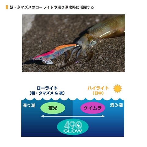 「490グロー」は、多くのイカが最も感知しやすいとされる波長490nm(単位:nm(ナノメートル))の光で発光。