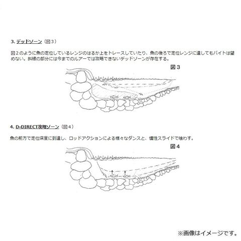魚の前方で定位深度に到達し、ロッドアクションによる様々なダンスと、慣性スライドで喰わす。