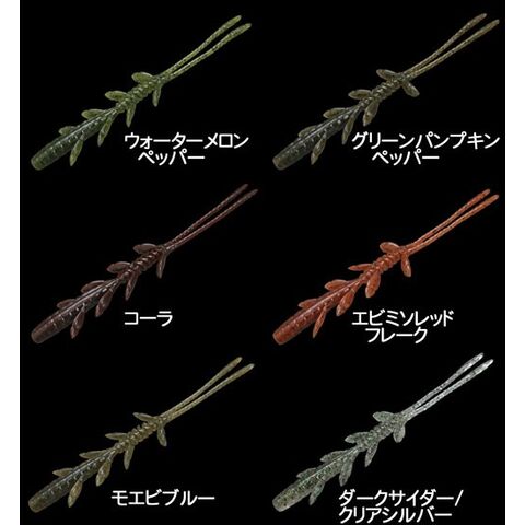サイズのすべて異なる4対のアームは、太さにテーパーのかかったボディに接続。それらの変化のあるボディワークから生まれるバイブ&弱ロールと、後部の2本のテールが生むバイブ&バタ足アクションのコンビネーションシグナルがこのワームの真髄です。