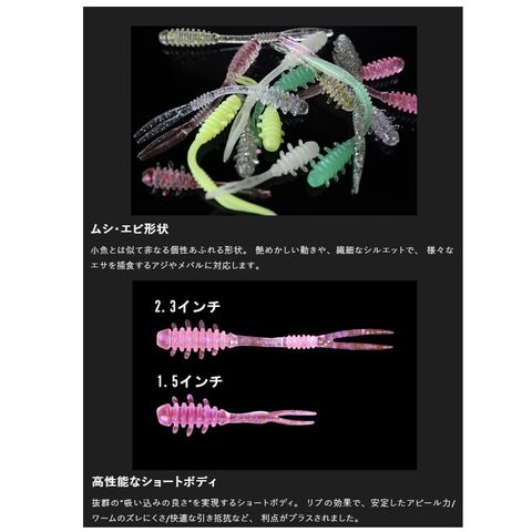 小魚を模したこれまでのワーム形状とは一線を画すムシ・エビ型。