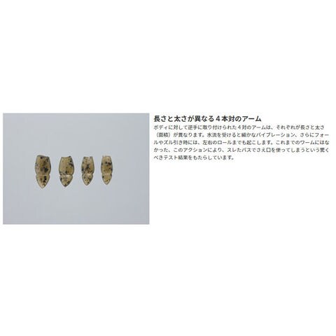 サイズのすべて異なる4対のアームは、太さにテーパーのかかったボディに接続。それらの変化のあるボディワークから生まれるバイブ&弱ロールと、後部の2本のテールが生むバイブ&バタ足アクションのコンビネーションシグナルがこのワームの真髄です。