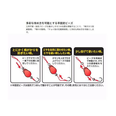 また半固定ビーズによりオモリの位置を容易に変更する事が出来、多彩な攻め方が可能です。