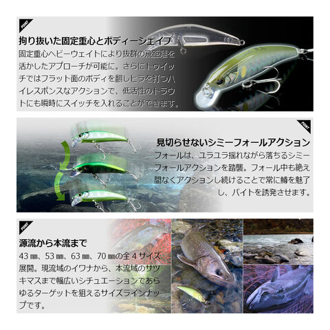 フォール中も絶え間なくアクションし続けることで常に鱒を魅了し、バイトを誘発させます。