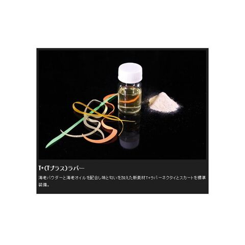 海老パウダーと海老オイルを配合し味と匂いを加えた新素材「T+(tasteプラス)ラバー」ネクタイと