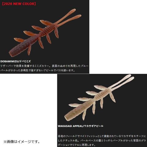 サイズのすべて異なる4対のアームは、太さにテーパーのかかったボディに接続。それらの変化のあるボディワークから生まれるバイブ&弱ロールと、後部の2本のテールが生むバイブ&バタ足アクションのコンビネーションシグナルがこのワームの真髄です。