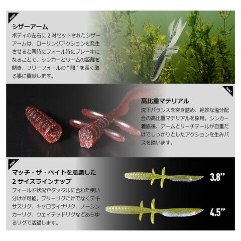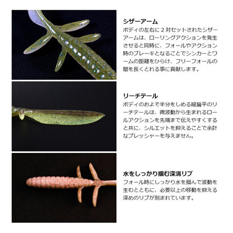 シンカー着底後、アームとリーチテールが自重だけでしっかりとしたアクションを生みバスを誘います。
