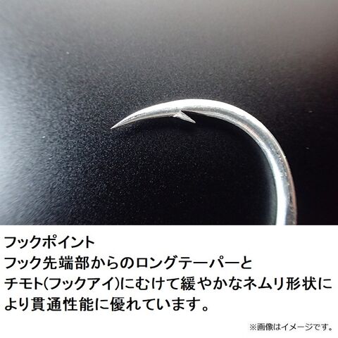 フック先端部からのロングテーパーとチモト(フックアイ)にむけて緩やかなネムリ形状により貫通性能に優れています。
