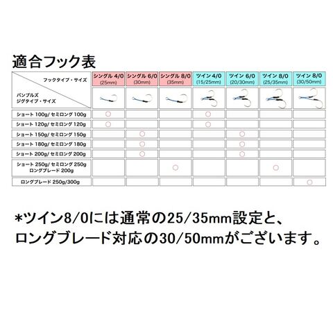 ●設定はシングルとツイン(段差仕様)の2タイプで、バンブルズジグの各モデルはもちろん、様々なメタルジグに対応いたします。