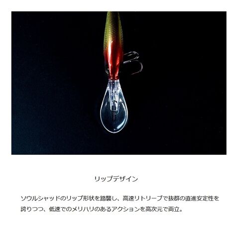 ソウルシャッドのリップ形状を踏襲し、高速リトリーブで抜群の直進安定性を誇りつつ、低速でのメリハリのあるアクションを高次元で両立。