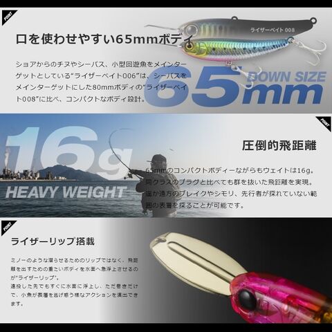 ショアからのチヌやシーバス、小型回遊魚をメインターゲットとしているライザーベイト006は、シーバスをメインターゲットにした80mmボディのライザーベイト008に比べ、コンパクトなボディ設計。