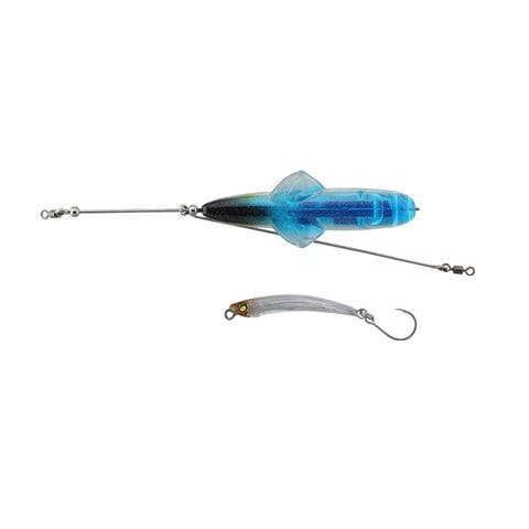 天秤形状をしたジェットロー本体が「飛ばし」とスプラッシュによる「寄せ」を担い、その後方を追うように泳ぐシラスサイズのバディ(喰わせルアー)にバイトさせるという仕組み。