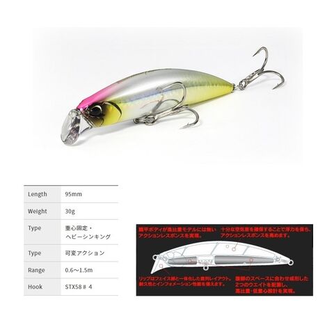 扁平デザインボディのより、高比重ながらリトリーブスピード範囲内に有効なアクションを集約。