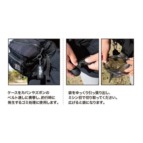 ●ケースをカバンやズボンのベルト通しに携帯し、釣行時に発生するゴミ処理に使用します。