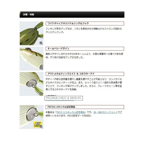 本製品は「FECO エコタックル認定商品」です。JB・NBCのトーナメントでご使用いいただけます。FECO認定マークを刻印。