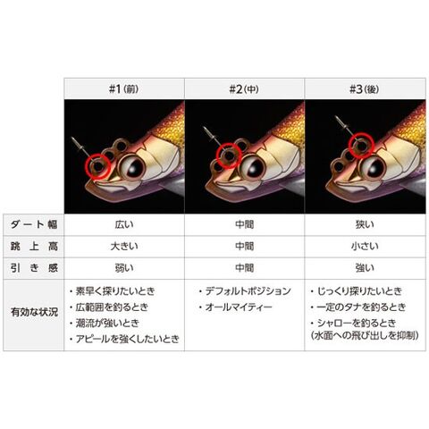 さらに、最も特徴的な3連ラインアイ。スナップの位置を付け変えるだけで、ダート幅や跳ね上げ高を調整できるため、水深や潮の流れ等に合わせて多彩なアプローチを可能にしてくれます。その対応範囲の広さはドリフト釣法はもちろん、様々なスタイルのエギングに高次元で対応。