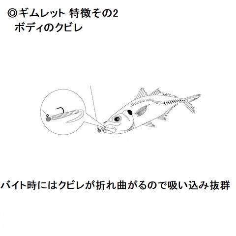 バイト時には小さな力で折れ曲がりワーム全体がターゲットの口内に吸い込まれやすくなるため、