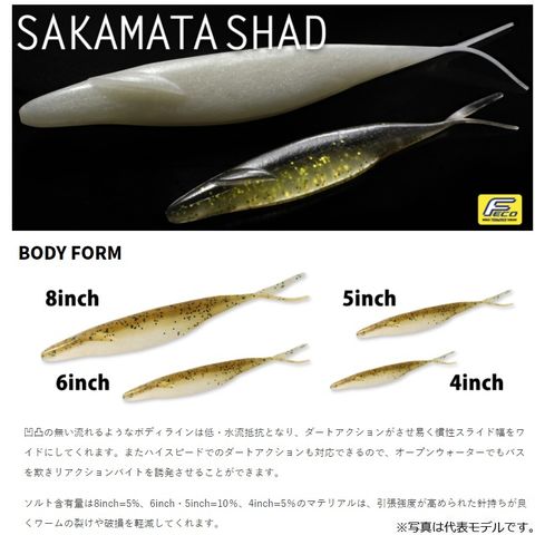 ノーシンカーでは、アユやハスが水面へ逃げ惑い、時折勢いよく水面から飛び出すような跳ね上がるダートアクション、スプリットショットやキャロライナリグのボトムレンジでも、バスに気付きボトムから突然現れ姿を隠すような跳ね上がるイメージでアクションすれば、“サカマタシャッド”の性能を発揮し、いとも簡単にバイトへと導いてくれます。