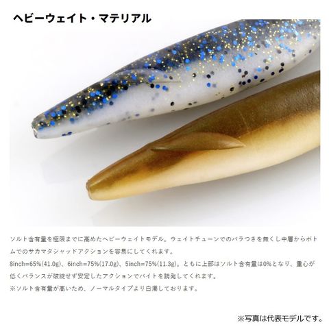 ソルト含有量は8inch=5%、6inch=10%のマテリアルは、引張強度が高められた針持ちの良くワームの裂けや破損を軽減してくれます。