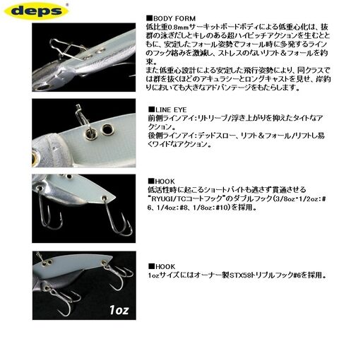 サーキットボードボディによるハイレスポンスは、アクションを起こすまでのニュートラルな“間”を即座に水を掴むことにより皆無にしてくれ、初期動作からハイピッチなバイブレーションでバイトを誘発してくれます。またフォールアクションでは低重心化による安定したフォールにより予期せぬ根掛かりや多発するライン絡みを激減してくれ、ストレスのないリフト&フォールを約束してくれます。