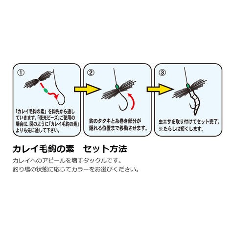 「夜光ビーズ」ご使用の場合は、図のように「カレイ毛鈎の素」よりも先に通して下さい。