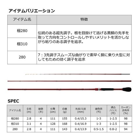 9:1超先調子の極280、310、スムーズな曲がりで素早く胴に乗りための効く7:3先調子の280の3アイテム。