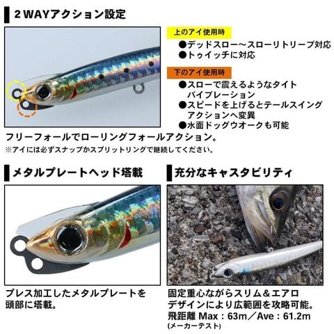 1つのルアーで2つのアクションを演出。上のアイ使用時:デッドスロー~スローリトリーブ対応でスローピッチワイドスイング。