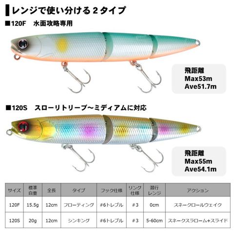 水中をスネークスラローム+イレギュラースライドで誘えるシンキングペンシル120S(120mm20g)の2タイプ。