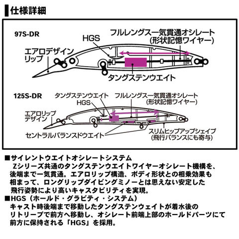 Zシリーズ共通のタングステンウエイトワイヤーオシレート機構を、後端まで一気貫通。