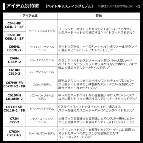 S字系ビッグベイトやスイムベイトに適応するパワーを備えたスローテーパーの「ビッグベイトモデル」。