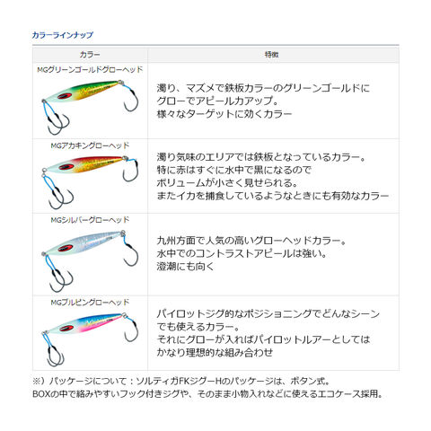 ※パッケージについて:ソルティガFKジグーHのパッケージは、ボタン式。