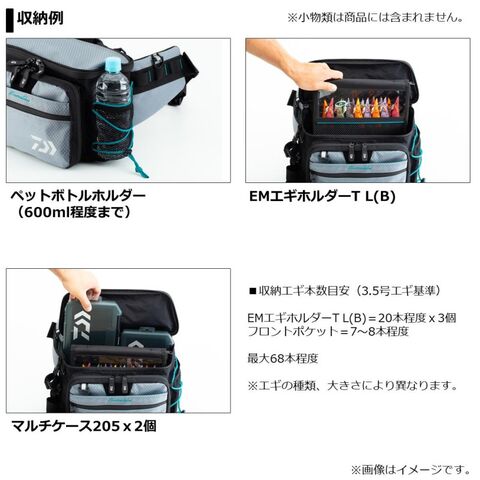 ■収納量例:当社エメラルダス エギホルダーT L(B)3個程度、中型ボックス(約21×15cm)3~4個程度