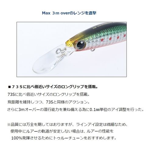 飛距離を維持しつつ、73Sと同様のアクション。さらに3mオーバーの潜行能力を兼ね備える為に0.1mm単位のアイ調整を行った。