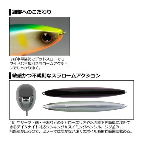 河川やサーフ・磯・干潟などのシャローエリアや水面直下を簡単に攻略できるデイ&ナイト対応シンキング&スイミングペンシル。